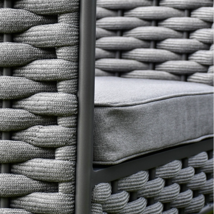 - Durable construction with high-quality materials: aluminum, rope, cushions, tempered glass tabletop.
